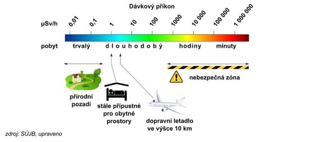 Na obrázku jsou znázorněny některé situace a odpovídající hodnoty dávkového příkonu. Je vidět, že hodnota 1 μSv/h (čtyřikrát vyšší dávkový příkon než maximální hodnota přírodního pozadí podle radiometrické mapy) je dle české legislativy přípustná pro obytné prostory a že na palubě dopravního letadla jsou hodnoty dávkového příkonu ještě cca 5x vyšší.