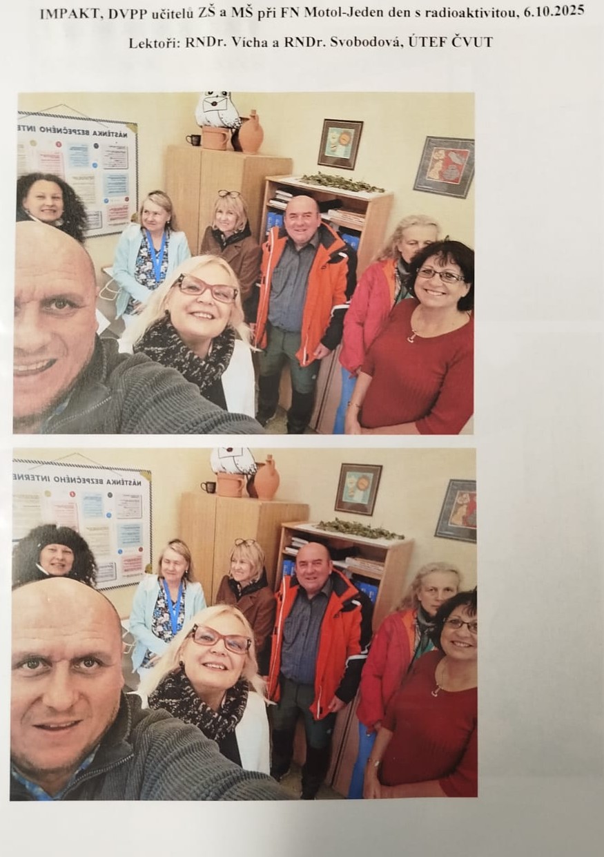 V pondělí 6. 10. 2025 pracovníci ÚTEF Vladimír Vícha a Jitka Svobodová ve spolupráci se SÚRO, v.v.i. realizovali pro pacienty nemocnice Motol workshop "Den s radioaktivitou" v rámci projektu Ministerstva vnitra ČR - „Centrum pro podporu obyvatelstva pro případ skutečného nebo domnělého vzniku mimořádných jaderných a radiačních událostí“ - VJ01010116 (IMPAKT). Přednášející začali workshopem pro studenty středních škol a žáků druhých stupňů základních škol a na závěr pro učitelé nemocniční školy. Prvním bodem pracovního semináře byla prezentace o radioaktivitě, následovala praktická měření v učebně a hledání "podezřelých kanystrů" na školní zahradě a zpracování a vyhodnocení naměřených dat. Ze zpětné vazby od žáků bylo vidět, že je téma radioaktivity zaujalo a workshop hodnotili jako zajímavý a přínosný.