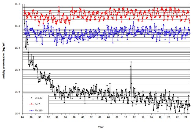 The artificial radionuclide 137Cs is coming mainly from the resuspension of the original fallout on ground surface. At the time being the activity concentration in the air aerosol is mostly below 1 µBq/m3. A part of the 137Cs activity is from the global fallout from the nuclear weapon tests in atmosphere and the substantial part from the Chernobyl accident. The 7Be is of cosmogenic orgin with the typical seasonal variation due to character of air convection during the year; its mean activity concentration is about 3000 µBq/m3. The 210Pb is a product of radon decay; its mean activity concentration is about 500 µBq/m3.